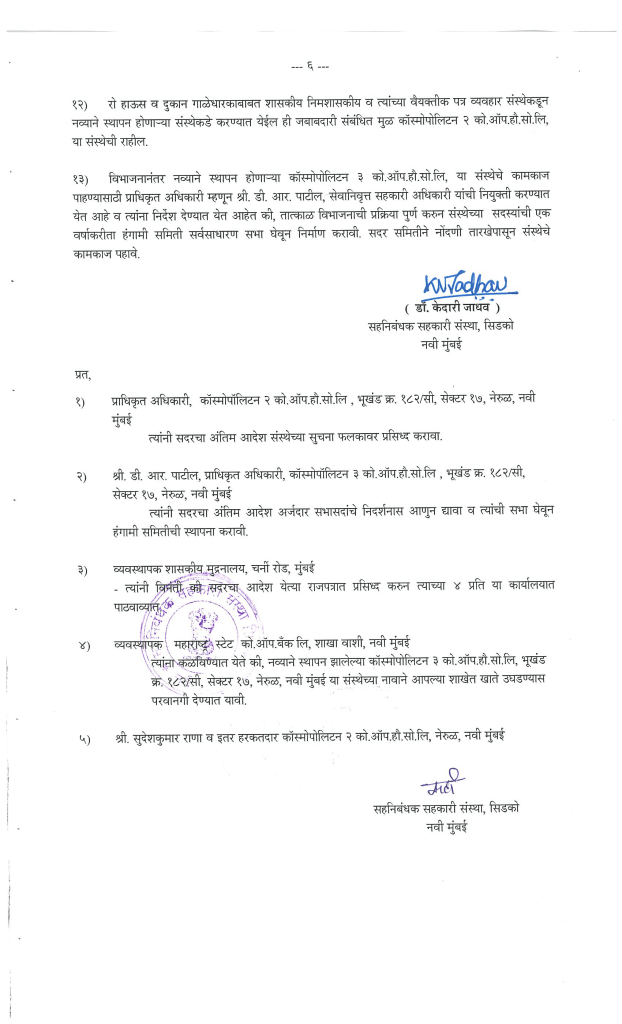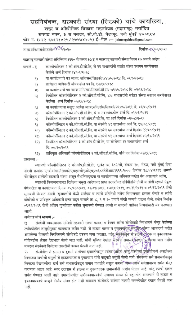 सहनिबंधक, सहकारी संस्था (सिडको) यांचा आदेश पत्र क्र.: जा.क्र.सनि / ससं / सिडको / २५९८ / २०२० दिनांक : २६ / ०६ / २०२० Like Loading...